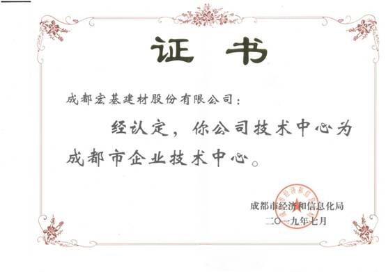 成都市经济和信息化局于2019年7月认定成都宏基建材股份有限公司为成都市企业技术中心单位。