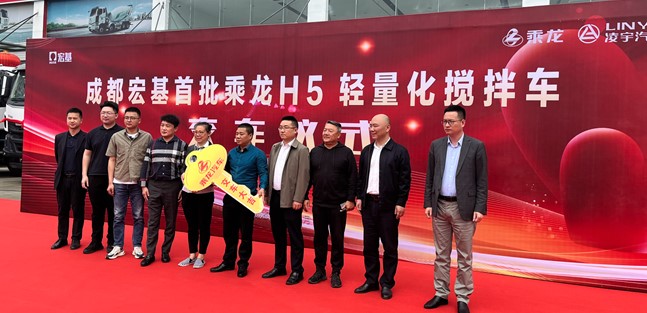 成都宏基首批乘龙H5轻量化搅拌车交付仪式在中集产业园成功举办。