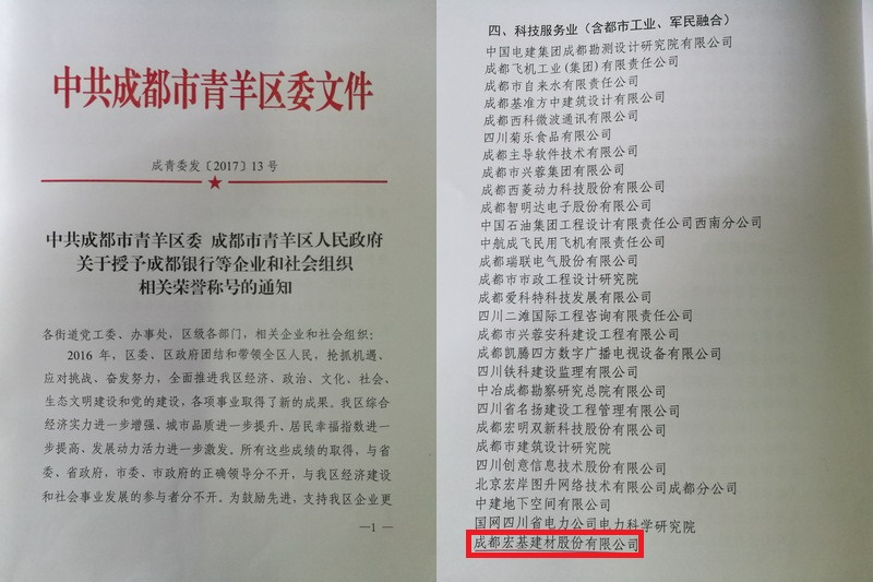 祝贺成都宏基建材股份有限公司获“青羊区2016年度地方贡献突出企业” 荣誉称号。我司将进一步为成都建设全面体现新发展理念的国家中心城市作出应有的贡献!