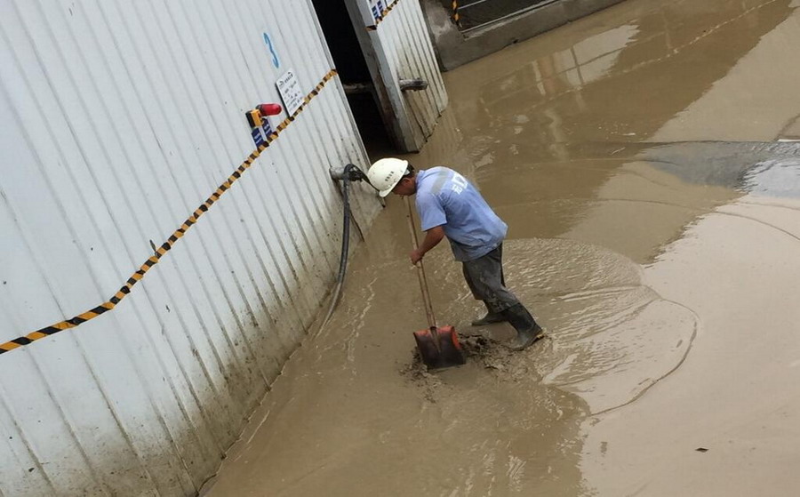 7月2日中午暴雨持续不断,眼看站内水位不断升高,分公司董经理当机立断,通知立即停产,生产区域全部断电,避免设备损坏和人员伤亡。同时安排装载机用机砂筑墙阻挡涌入水流。洪水态势基本得到遏制后,随即召开防汛紧急会议,部署当前抢险工作安排、夜间值班工作安排以及后期防洪应急预案的完善,同时预估设备损坏情况,当即通知配件厂家备货及送货,以便日后抢修,会议多次强调安全第一,抢险第二。在保证安全前提下尽快排出站内积水,避免积水水压对墙体和站设备基础造成的严重损坏。场内和基坑积水排除后立即对设施设备进行全面检修,尽快恢复生产。