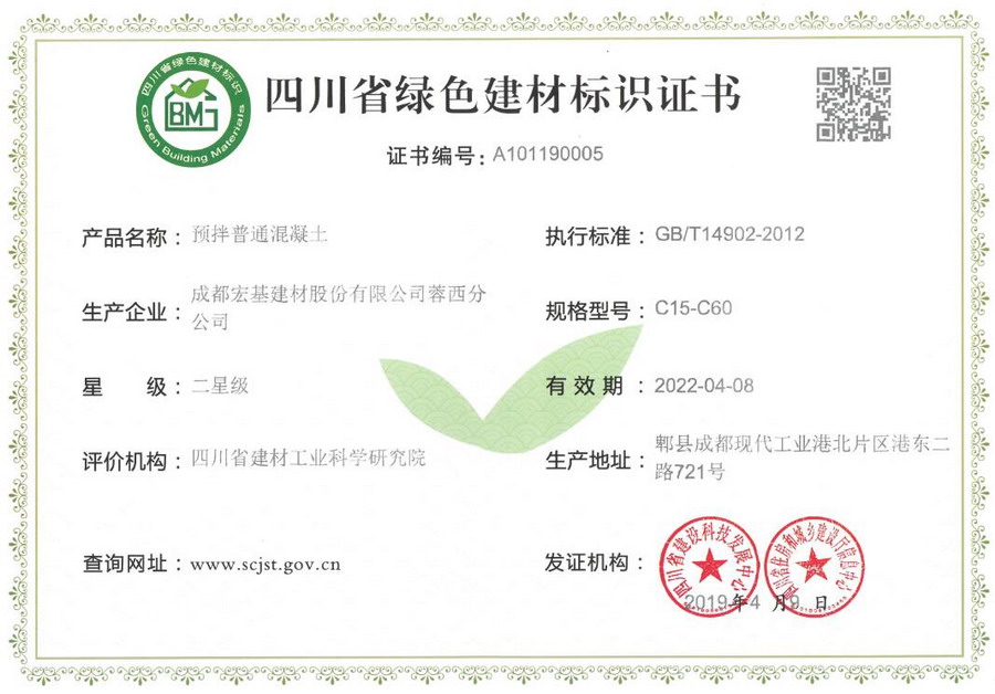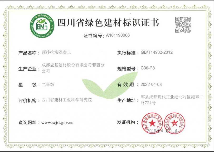根据住房城乡建设部印发的《绿色建材评价标识管理办法》(建科[2014]75号)、四川省住房和城乡建设厅印发的《四川省绿色建材评价标识管理细则》(川建勘设科发[2014]581号)、《四川省绿色建材评价技术导则》和《四川省绿色建材评价技术细则》等文件的规定和要求。蓉西分公司所生产的C15-C60预拌普通混凝土以及C30P8预拌抗渗混凝土通过各级评审专家审核及公示,并于2019年4月9日取得“四川省绿色建材标识证书”,证书编号:A101190005、A101190006。