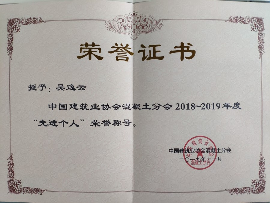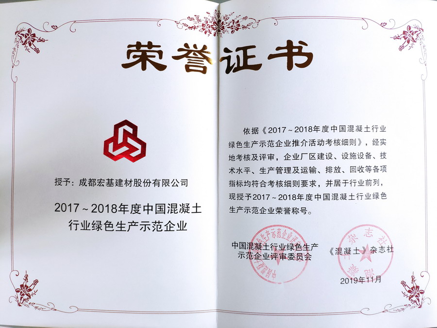 2019年11月25日至29日,由中国建筑业协会混凝土分会主办的2019年中国混凝土年会暨混凝土行业高质量发展论坛在广东珠海隆重举行,会上成都宏基建材股份有限公司再次获得2017-2018年度中国混凝土行业绿色生产示范企业荣誉称号,公司董事长兼总裁吴逸云先生被评为中国建筑业协会混凝土分会2018-2019年度“先进个人”。