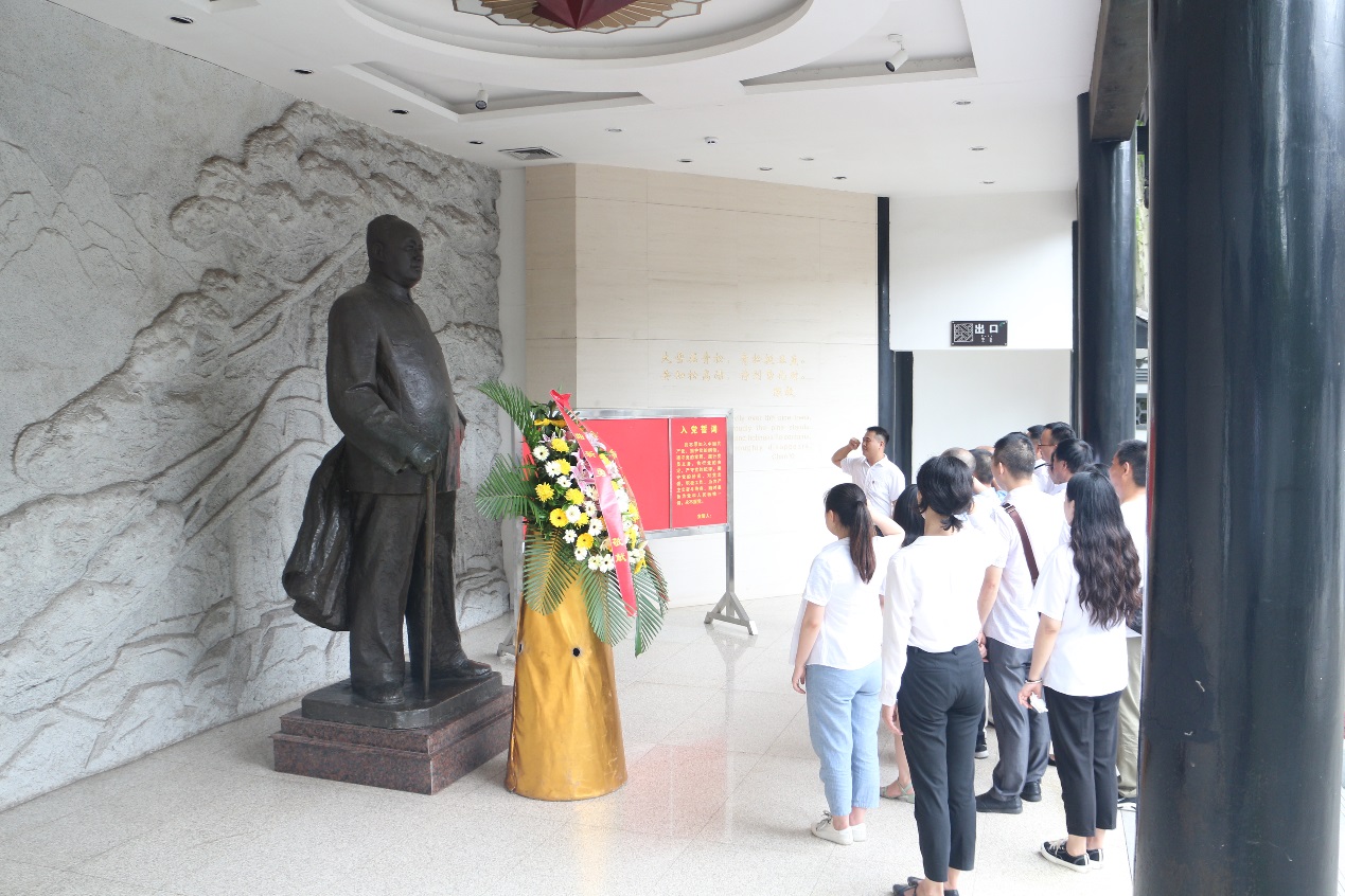 在讲解员带领下,大家先后瞻仰了陈毅故居和陈毅生平事迹陈列馆,在一系列的参观学习中,同志们了解到这位戎马一生、为革命事业奋斗终身的元帅生平事迹。陈毅元帅从切身的革命经历中认识到,只有马克思主义才是解决中国问题的真理。在确立马克思主义信仰、树立为共产主义事业奋斗的崇高理想后,无论面对什么样的艰难险阻和重大挫折,他始终没有动摇。陈毅元帅坚决执行党的革命外交路线和军事路线,为我国的外交事业和中国人民解放军的革命化、现代化作出了重大贡献。在陈毅元帅雕像前,全体党员面对党旗庄严肃立,紧握右拳用响亮的声音重温入党誓词,在党旗下接受心灵的净化和洗礼,牢记共产党员的初心和使命。