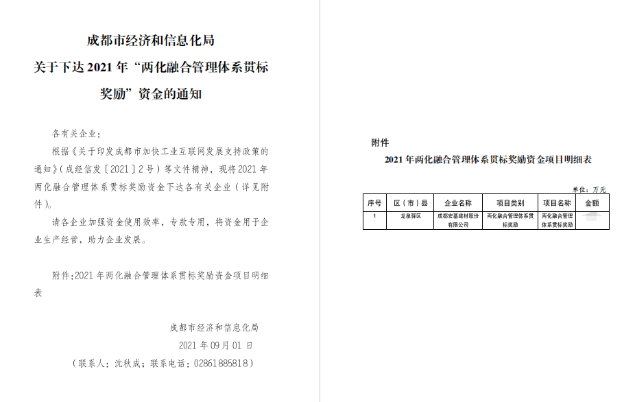 2021年9月1日,成都宏基建材股份有限公司两化融合管理体系贯标奖励项目顺利通过成都市经济和信息化局的最终公示,获得政府奖励金。标志着公司的两化融合管理体系贯标工作获得权威机构的肯定以及政府的嘉奖!