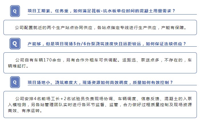 “连续供应、保质量、保数量”,这是客户最简单也是最严苛的诉求,为顺利完成筏板-抗水板浇筑供应保障,公司生产保供团队第一时间进行现场查勘、确认浇筑方案、排查潜在风险,从技术方案制定-原材料筹备-生产保障-运输保障-泵送保障-应急保障等各环节、各维度着手进行细致交底、工作部署。凡事预则立,我们只为做的更好。