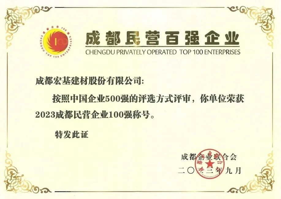 9月25日,由成都企业联合会发起的“2023成都企业100强发布会”在成都举行。会议发布了2023年成都企业100强系列榜单,成都宏基建材股份有限公司第五次荣膺“2023成都民营企业100强”。