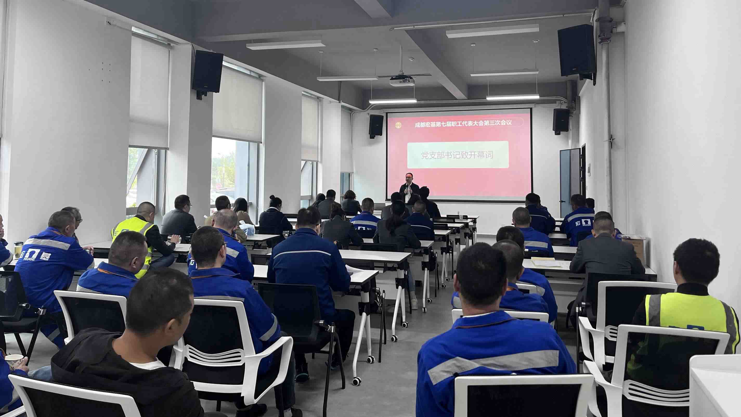 2024年10月10日,成都宏基建材股份有限公司第七届三次职工代表大会在公司绿色建材智造中心会议室顺利召开。公司党支部书记、常务副总裁周世洪,副总裁吴雨等领导出席会议并发重要讲话。共有47名来自各部门的职工代表参与了此次会议。