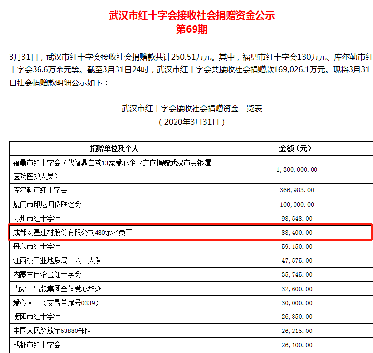 2020年年初,新冠肺炎疫情波及全球,各行各业均停工停产共同抗击病疫,成都宏基作为一家有社会责任担当的企业,大年初六接政府抗疫指挥部急需商砼建设医疗设施的通知后,公司克服诸多困难急招部分员工到岗复产全面保障了抗疫建设需求。随即公司又向成都市、区各级红十字会捐赠人民币50万元。